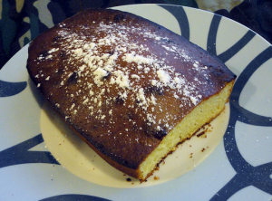 - Ponemos el horno a calentar a 180º y ponemos la masa en un molde. Para que no se pegue, ya que no lleva casi aceite, se puede utilizar papel de horno para forrar el molde. con ese papel.