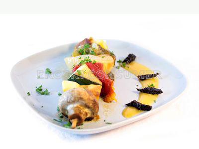 Brocheta de hortalizas con crema de albaricoque y ciruela