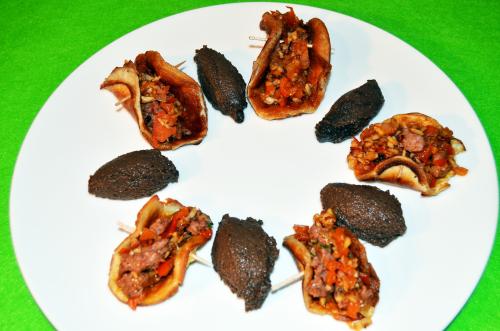 - En un plato, ponemos el paté te olivas en forma de croqueta ayudándonos con dos cucharas, 1 unidad por burrito.