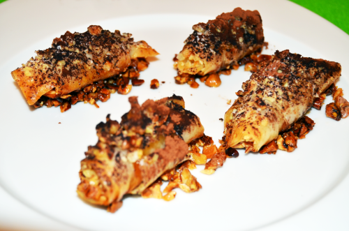 - En la parte más ancha de la pasta filo le ponemos la mezcla de los frutos secos y enrollamos poco a poco hasta la punta haciendo forma de media luna, así con las 4 porciones.