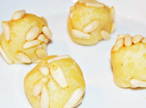 - Ponemos los piñones en un plato y rodamos las bolas que hemos hecho antes por encima de los piñones, conseguiremos que se peguen alrededor de ellas.