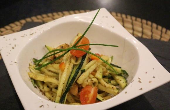- Corta el calabacín en tiras finas y largas (tipo espagueti).