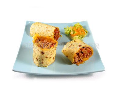 - Rellenamos los discos de arroz, enrollamos, horneamos durante 5 minutos en el horno a 200º C. Esperamos a que se templen y servimos con un poco de lechuga rizada troceada.